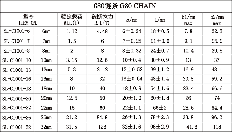 1、EN818-2标准起重链条。 2、在2.5倍工作拉力下进行验证测试。 3、破断拉力试工作拉力的4倍。
